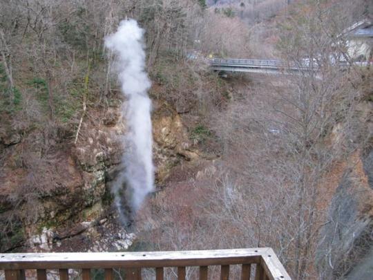 川俣温泉にある噴泉橋の真下、40~50分ごとに高温泉を20~30メートルも噴き上げるのが間欠泉です。地を響かせながらゴーツという号音とともに噴き上げる姿は、まさに壮観。あたりの静けさが一瞬打ち破られ、自然の力の偉大さに驚かされます。気温の低い日には、大きく白い湯気が立ち、迫力満点です。