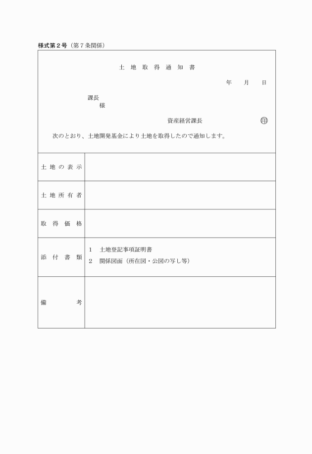 第7条 資産経営課長は、基金により土地を取得したときは、当該土地を要求した課長に対し、土地取得通知書(様式第2号)を送付するものとする。