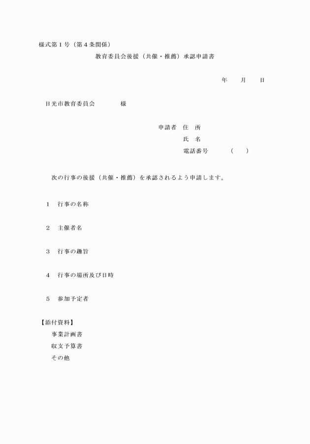 第4条 後援等の承認を申請しようとする者(以下「申請者」という。)は、教育委員会後援(共催・推薦)承認申請書(様式第1号)を行事を開催する1箇月前までに教育委員会に提出しなければならない。