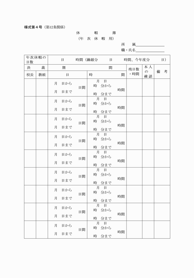 第10条 学校職員の勤務時間その他の勤務条件に関する条例(平成7年栃木県条例第5号。以下「勤務時間等条例」という。)第5条の規定による週休日の振替及び4時間の勤務時間の割振り変更は、週休日の振替及び勤務時間の割振り変更簿(様式第2号)により行うものとする。