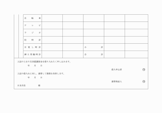第7条 災害援護資金(以下「資金」という。)の貸付けを受けようとする者(以下「借入申込者」という。)は、日光市災害援護資金借入申込書(様式第2号。以下「借入申込書」という。)を市長に提出しなければならない。