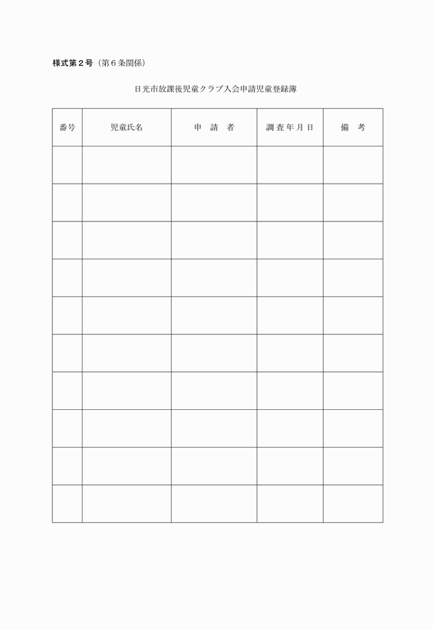 第6条 児童クラブに入会を希望する児童の保護者は、日光市放課後児童クラブ入会申請書(様式第1号)により市長に申請しなければならない。