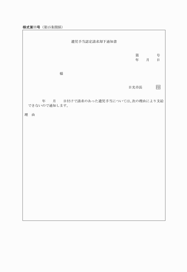 第15条 市長は、認定の請求があった場合において、受給資格がないと認めたときは、遺児手当認定請求却下通知書(様式第11号)を請求者に交付しなければならない。