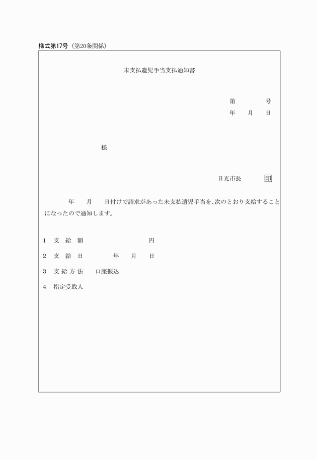 第20条 市長は、未支払遺児手当請求書を受理したときは、未支払遺児手当支払通知書(様式第17号)を請求者に交付しなければならない。