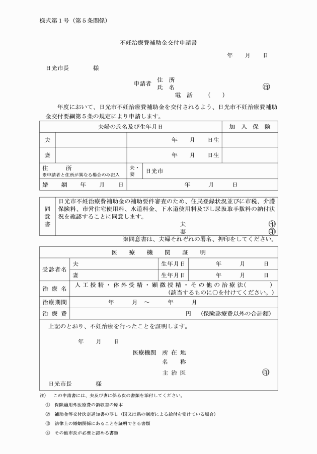 第5条 補助金の交付を受けようとする者は、不妊治療費補助金交付申請書(様式第1号)に夫及び妻に係る次に掲げる書類を添えて市長に申請しなければならない。この場合において、医療保険各法の規定による電子資格確認、資格確認書の提示その他の方法により被保険者、組合員、加入者又は被扶養者であることの確認を受けるものとする。