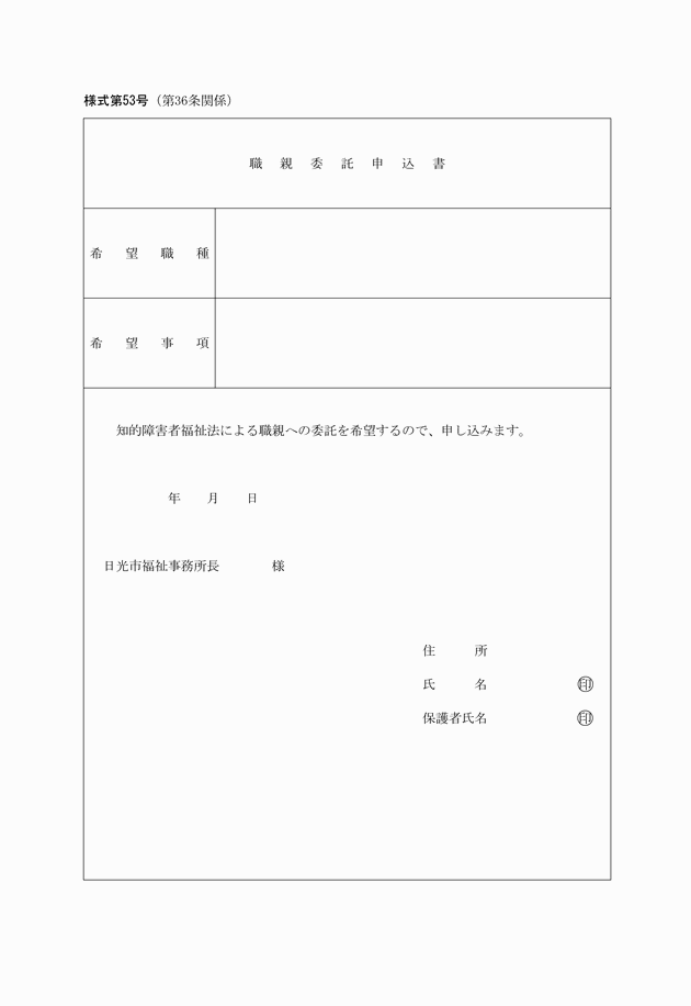 第35条 職親になることを希望する者が行う施行規則第39条の規定による申出は、知的障害者職親申込書(様式第50号)により福祉事務所長に対し行うものとする。