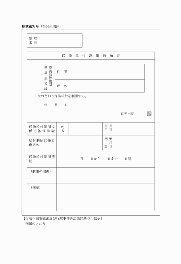 2 市長は、保険給付の制限を行ったときは、直ちに当該保険医療機関等及び当該被保険者の属する世帯の世帯主に対して保険給付制限通知書(様式第37号)により通知するものとする。