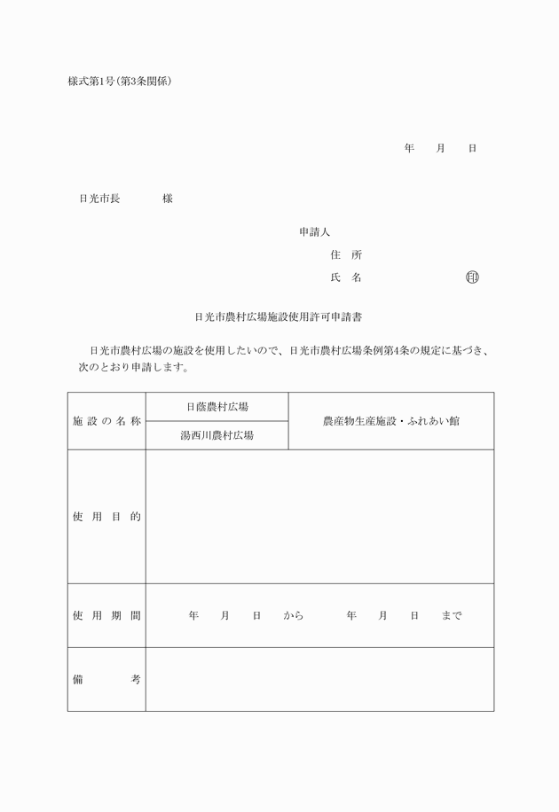 第1条 この規則は、日光市農村広場条例(平成18年日光市条例第204号。以下「条例」という。)第14条の規定に基づき、条例の施行に関し必要な事項を定めるものとする。