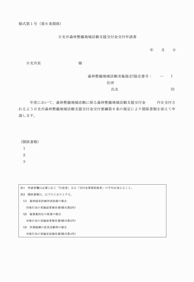 第1条 市の交付する日光市森林整備地域活動支援交付金(以下「交付金」という。)については、日光市補助金等交付規則(平成18年日光市規則第59号。以下「規則」という。)に規定するもののほか、この要綱の定めるところによる。
