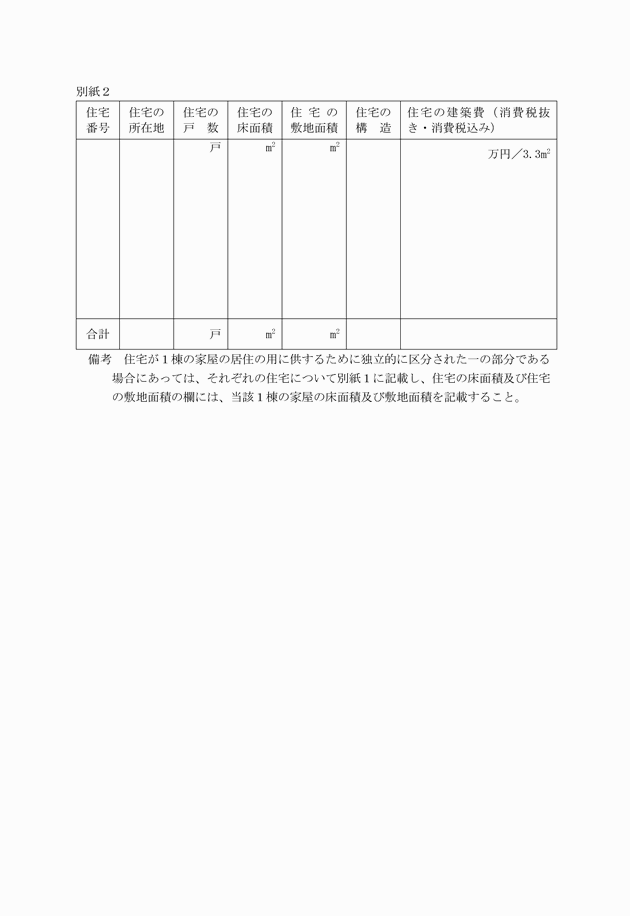 4 第2項第7号の床面積計算書は、各戸及び各階ごとに居住の用に供する部分と居住の用に供する部分以外の部分との別、専有部分と共有部分との別、住宅部分の非住宅部分との別、延床面積各階ごとの床面積、共用部分が家屋の延床面積に占める比率その他住宅の居住の用に供する部分を算定するために必要な事項を記載したものとする。