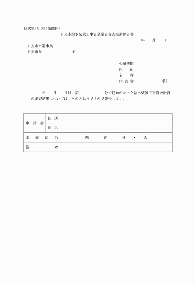 第3条 融資あっせんを受けようとする者(以下「申請者」という。)は、給水装置工事に着工するまでに、日光市給水装置工事資金融資あっせん申請書(様式第1号。以下「申請書」という。)を水道事業管理者の権限を行う市長(以下「管理者」という。)に提出しなければならない。