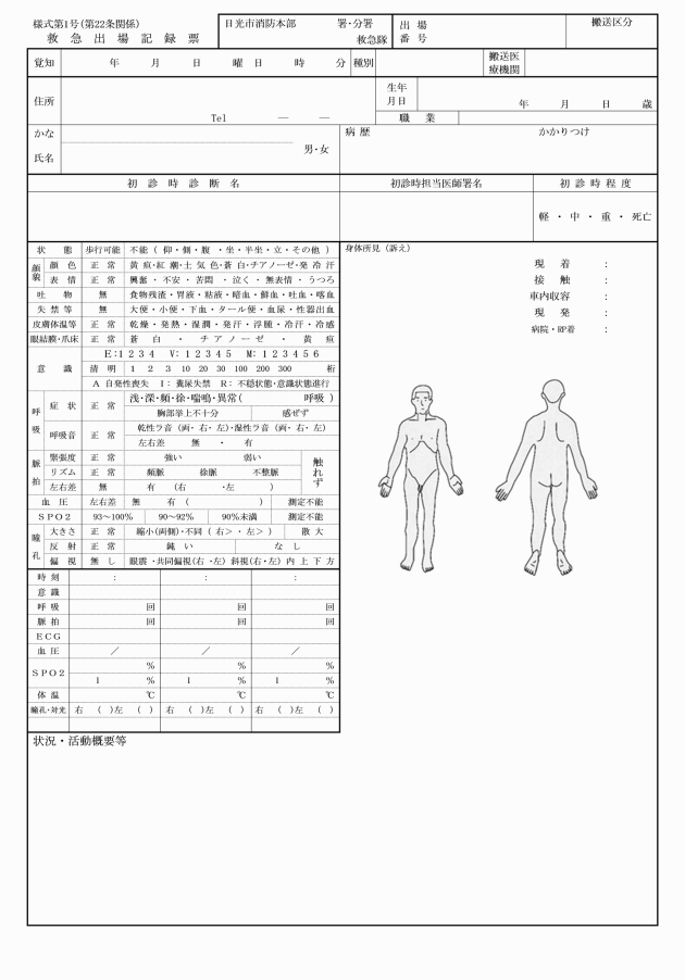 第22条 隊長は、救急活動を行ったときは、救急出場記録票(様式第1号)に救急活動を行った年月日、傷病者の状態、住所、氏名、年齢及び性別並びに活動概要等所要の事項を記録しておくものとする。
