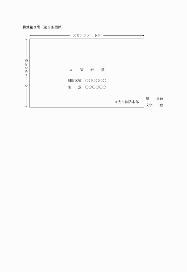 第5条 法第23条の規定により市長が一定区域におけるたき火又は喫煙の制限をしたときは、その区域の見やすい箇所に様式第3号の標識を掲げるものとする。