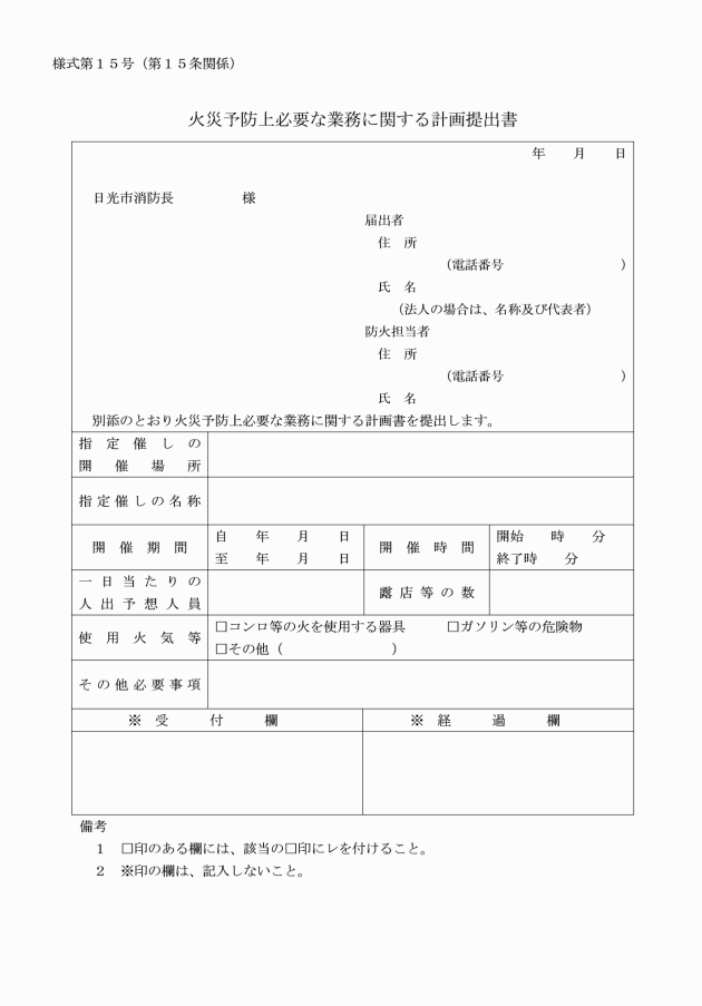 第15条 条例第42条の3第2項の規定により火災予防上必要な業務に関する計画を提出する者は、火災予防上必要な業務に関する計画提出書(様式第15号)に当該計画を添えて、正本1部及び副本1部を消防長に提出するものとする。