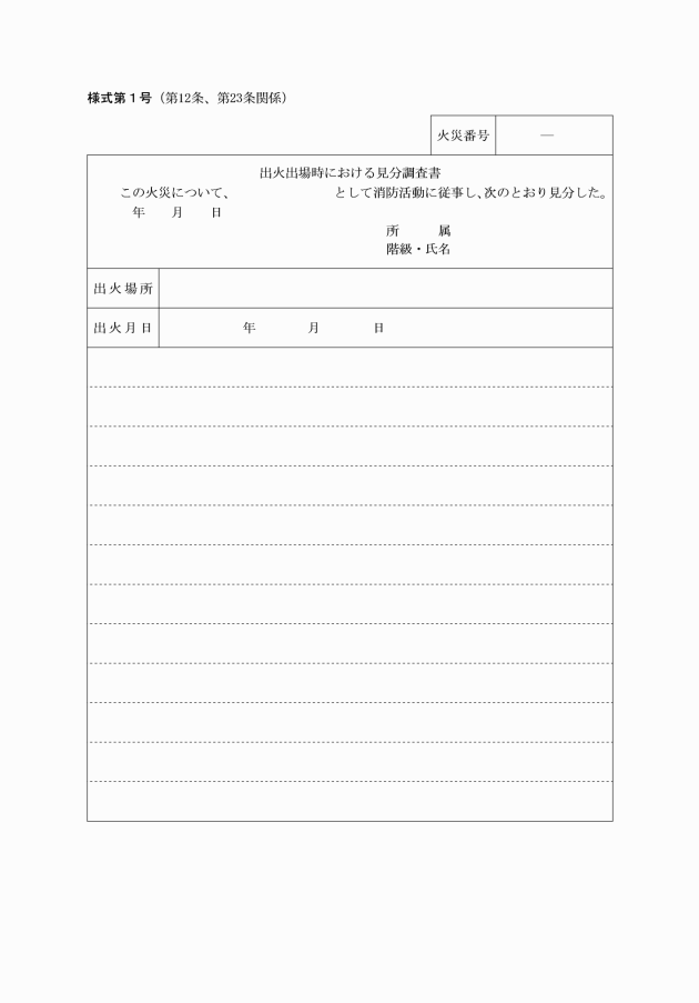 第12条 消防隊員は、火災現場に出向いたときは、消火活動中における火煙の色、臭い、燃焼音、延焼経路その他関係者の言動等の見分に努め、現場指揮者に報告しなければならない。