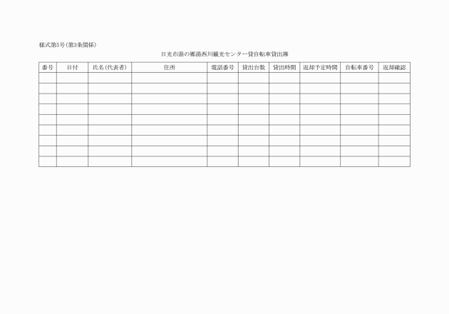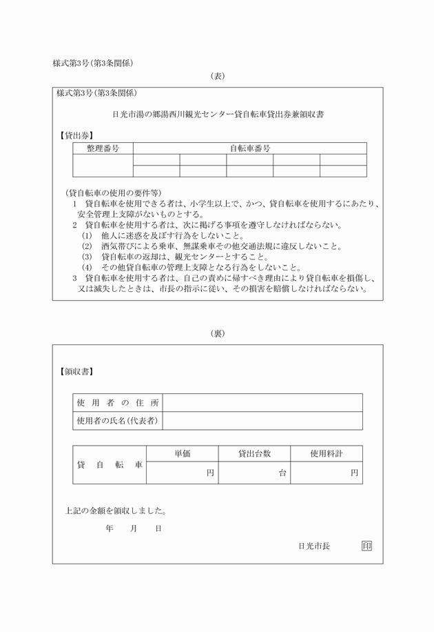 第6条 条例第12条ただし書の規定により使用料等の還付を受けようとするときは、日光市湯の郷湯西川観光センター使用料等還付申請書(様式第8号)を市長に提出しなければならない。