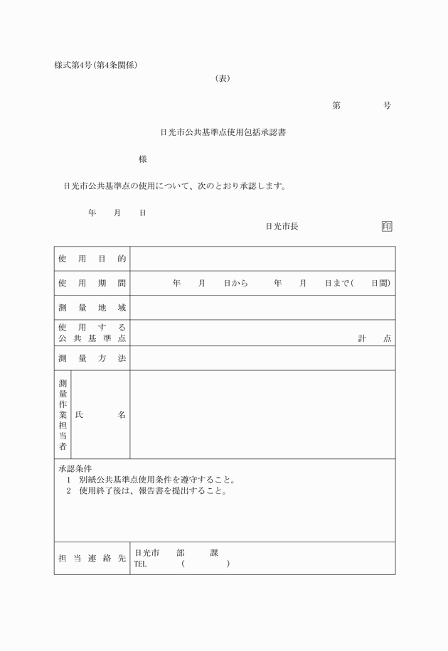 第4条 公共基準点を使用しようとする者は、あらかじめ日光市公共基準点使用承認申請書(様式第1号)により市長に申請しなければならない。