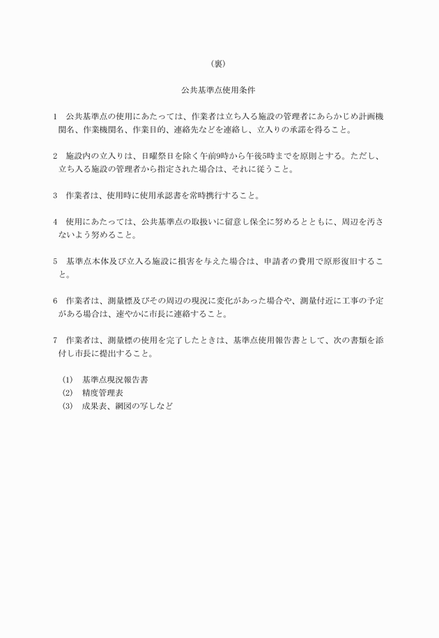 第5条 前条の規定により公共基準点の使用の許可を受けた者(以下「使用者」という。)が公共基準点を使用するときは、使用承認書を常時携帯し、市職員、土地所有者等の請求があった場合は、速やかにこれを呈示しなければならない。