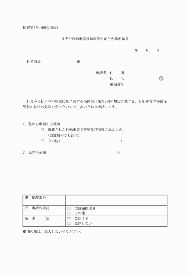 第8条 自転車等の返還を受けようとする当該自転車等の利用者等は、その氏名及び住所並びに自転車等のかぎその他当該利用者等であることを証明するものを提示し、かつ、日光市保管自転車等返還申請書兼受領書(様式第4号)を提出し、返還を受けるものとする。