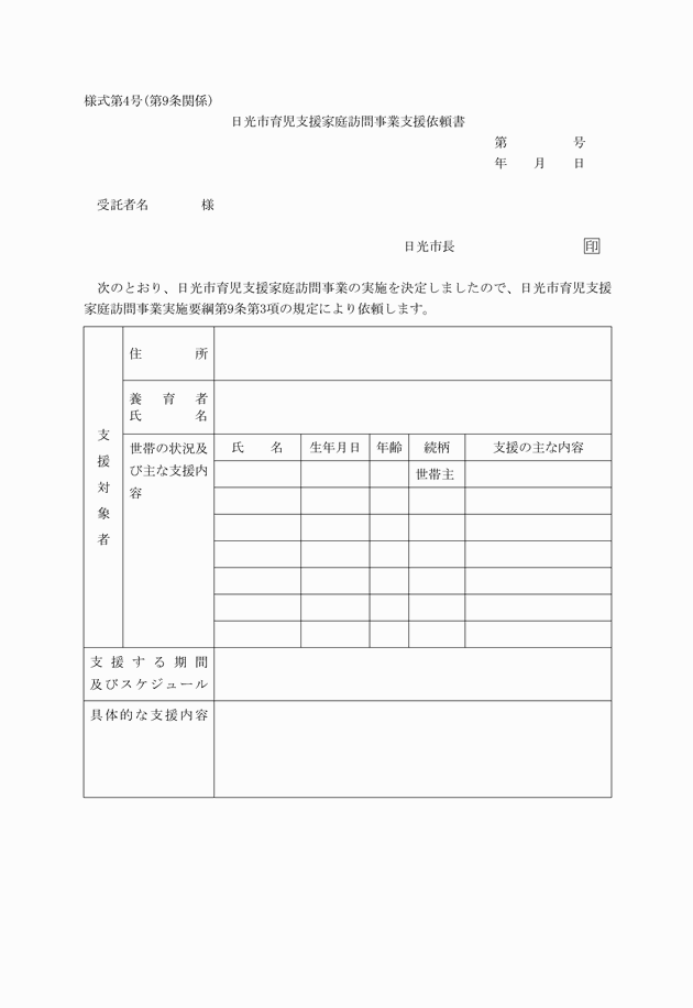 第4条 支援の実施が必要な家庭(以下「支援家庭」という。)は、本市に居住する児童又は養育者であって、日光市要保護児童対策地域協議会の構成機関、団体等及び市民からの連絡、通告等により特に育児支援が必要であると市長が判断したものがいる次の各号のいずれかに該当する家庭とする。