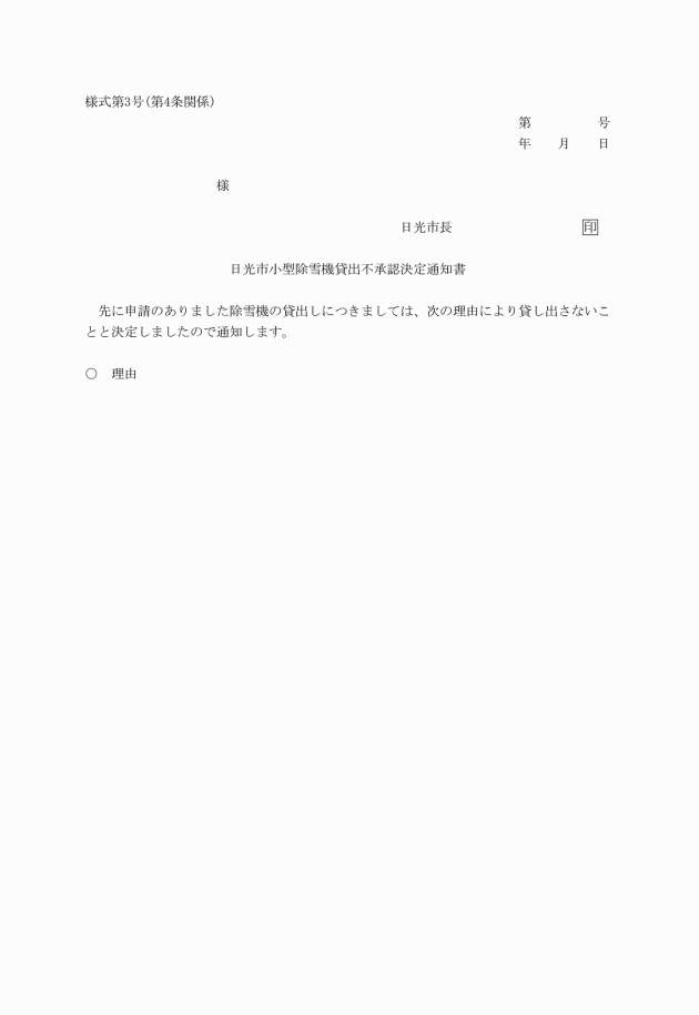 第3条 除雪機の貸出しを受けようとする団体は、原則として貸出日の14日前から7日前までに、日光市小型除雪機貸出申請書(様式第1号)により市長に申請しなければならない。
