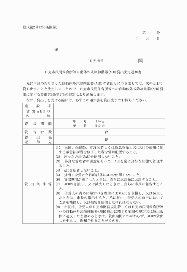 ○日光市民間保育所等への自動体外式除細動器(AED)貸出に関する要綱