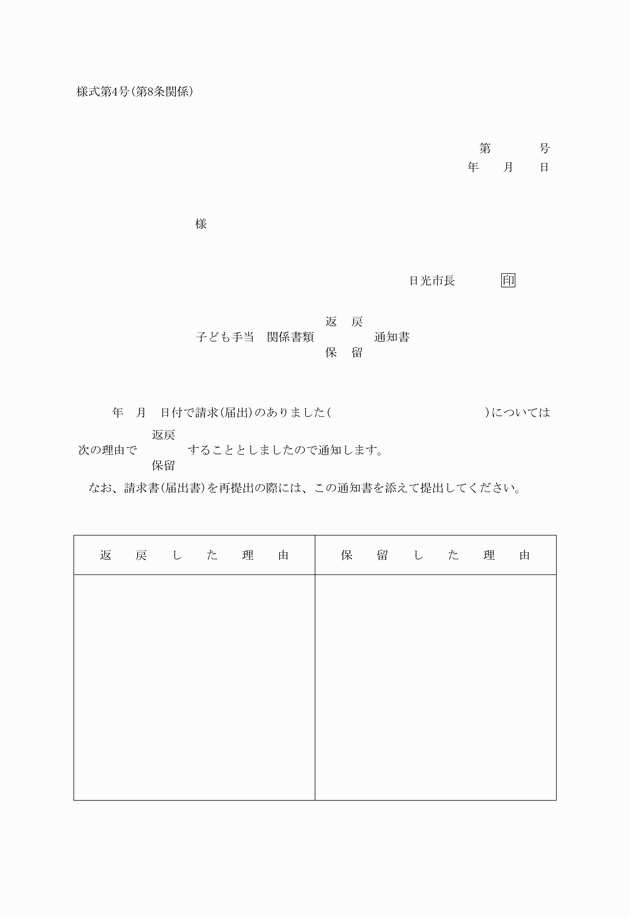 ア 認定請求書を返戻する場合は、子ども手当関係書類返戻・保留通知書(様式第4号。以下「返戻等通知書」という。)により通知書を作成し、その認定請求書に添えて返戻すること。