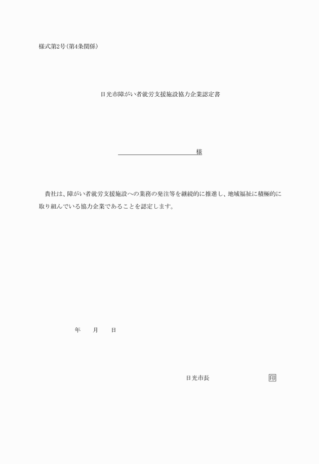第4条 協力企業が認定を受けようとするときは、日光市障がい者就労支援施設協力企業認定申請書(様式第1号)に別に定める書類を添付し、市長に申請するものとする。