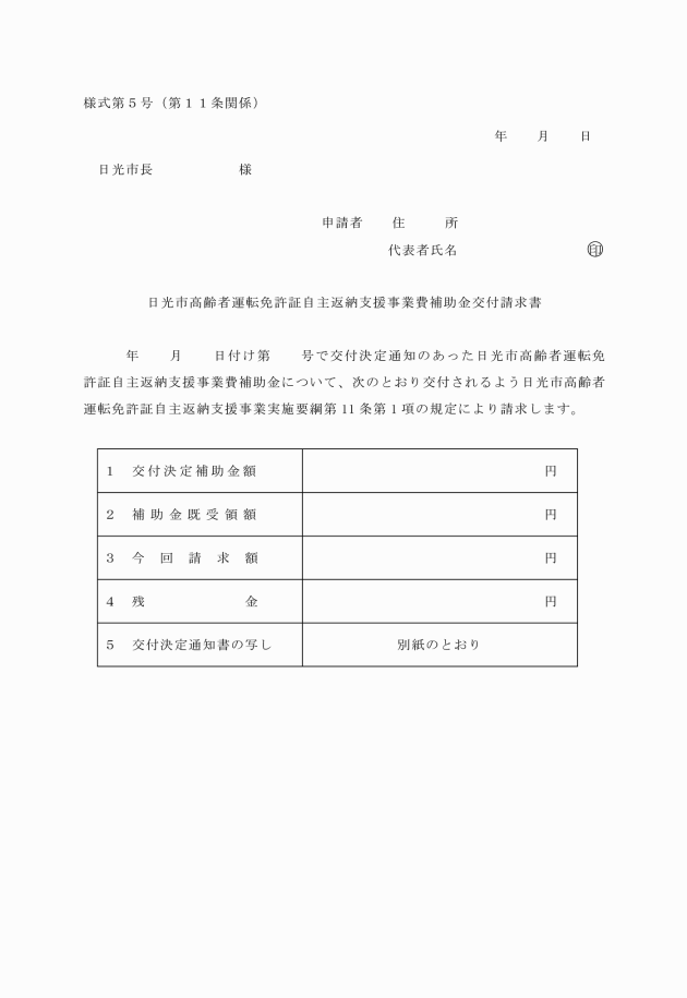 第9条 補助金の交付を受けようとする協力事業者は、毎月10日までに、日光市高齢者運転免許証自主返納支援事業費補助金交付申請書(様式第3号)に前月分の利用券及びを添付して市長に提出しなければならない。