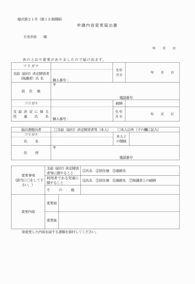第15条 省令第22条第1項、第34条の3第4項及び第34条の48第1項に規定する申請内容の変更の届出は、申請内容変更届出書(様式第21号)によるものとする。
