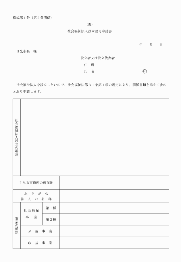 第2条 施行規則第2条第1項に規定する申請書は、社会福祉法人設立認可申請書(様式第1号)とする。