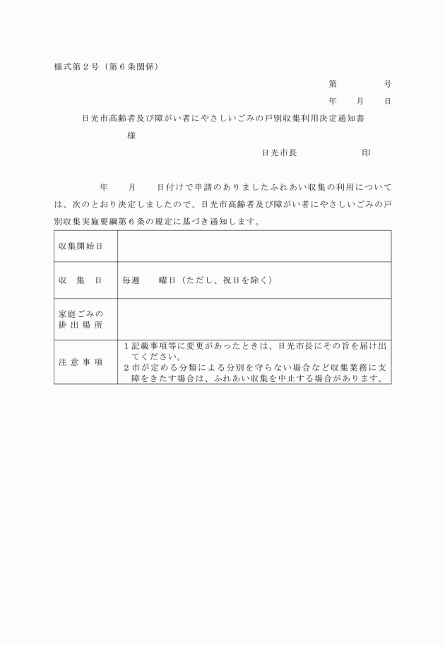 第4条 ふれあい収集を利用しようとする世帯の世帯主又はその代理人(以下「申請者」という。)は、日光市高齢者及び障がい者にやさしいごみの戸別収集利用申請書(様式第1号。以下「申請書」という。)に必要書類を添えて、市長に提出しなければならない。