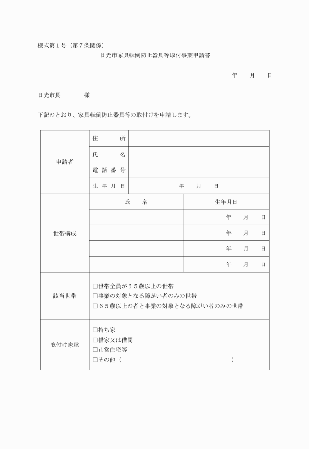 第7条 事業を利用しようとする者(以下「申請者」という。)は、日光市家具転倒防止器具等取付事業申請書(様式第1号)を市長に提出するものとする。