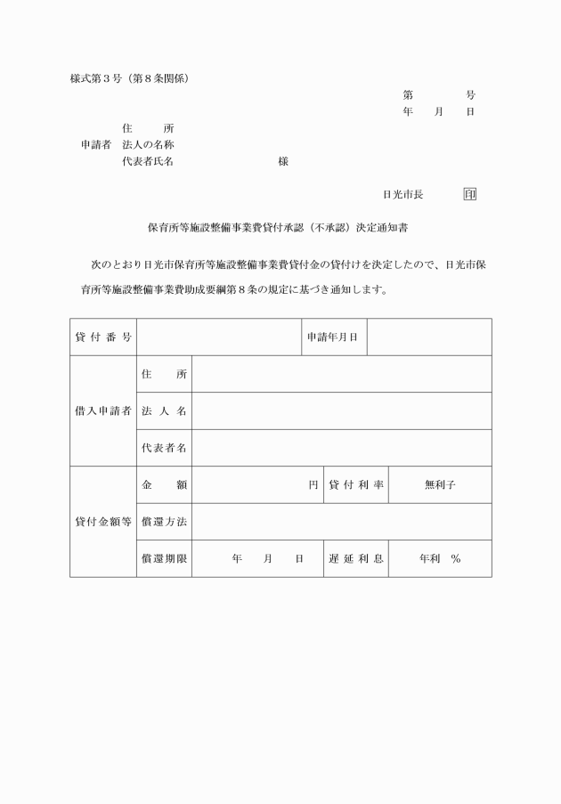 第8条 貸付金の貸付けを受けようとする者(以下「申請者」という。)は、保育所等施設整備事業費貸付申請書(様式第1号)に次に掲げる書類を添えて市長に申請しなければならない。