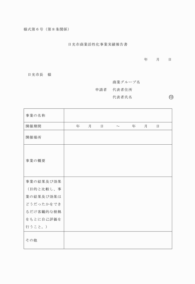 第8条 交付申請者は、補助対象事業が完了したときは、速やかに日光市商業活性化事業実績報告書(様式第6号)に次に掲げる書類を添えて市長に提出しなければならない。