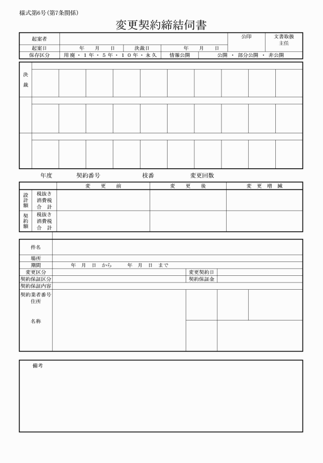 第7条 工事等の変更契約締結は、変更契約締結伺書(様式第6号)により行うものとする。