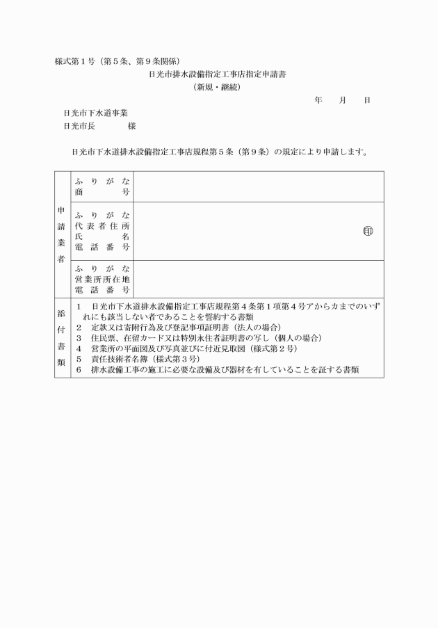 第5条 指定工事店としての指定を受けようとする者は、日光市排水設備指定工事店指定申請書(様式第1号)を管理者に提出しなければならない。