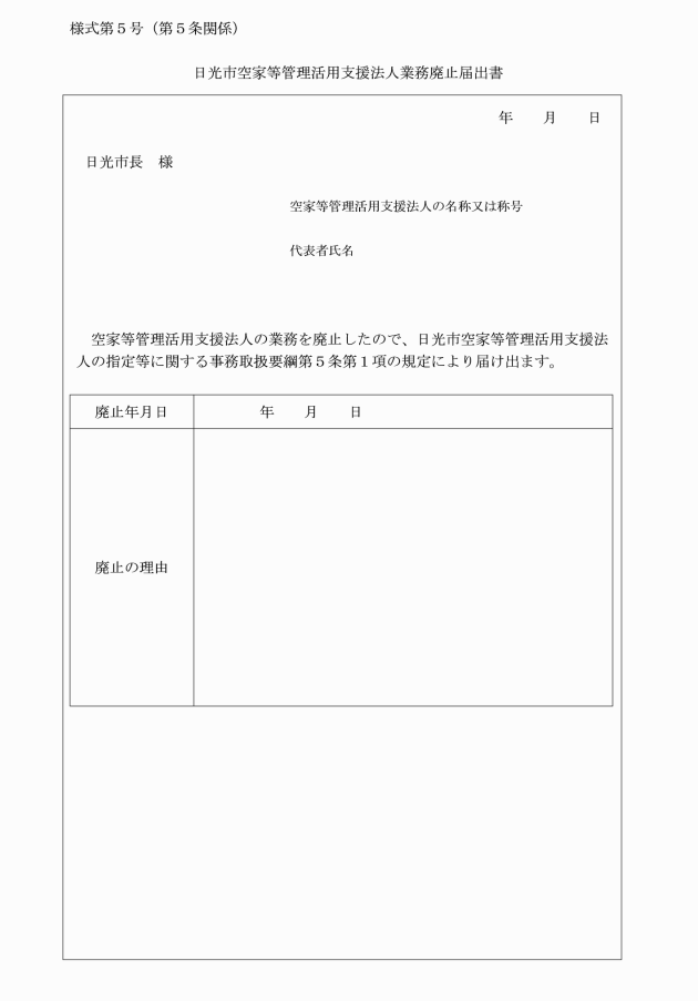 第5条 支援法人は、その業務を廃止したときは、直ちに日光市空家等管理活用支援法人業務廃止届出書(様式第5号)により市長に届け出るものとする。