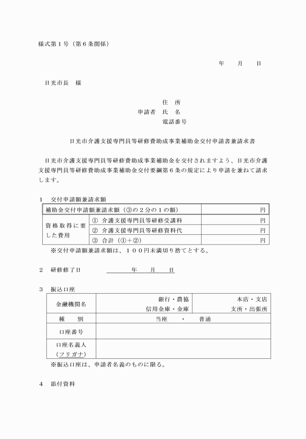第6条 補助金の交付を受けようとする補助対象者は、日光市介護支援専門員等研修費助成事業補助金交付申請書兼請求書(様式第1号)に次に掲げる書類を添えて、市長に提出するものとする。
